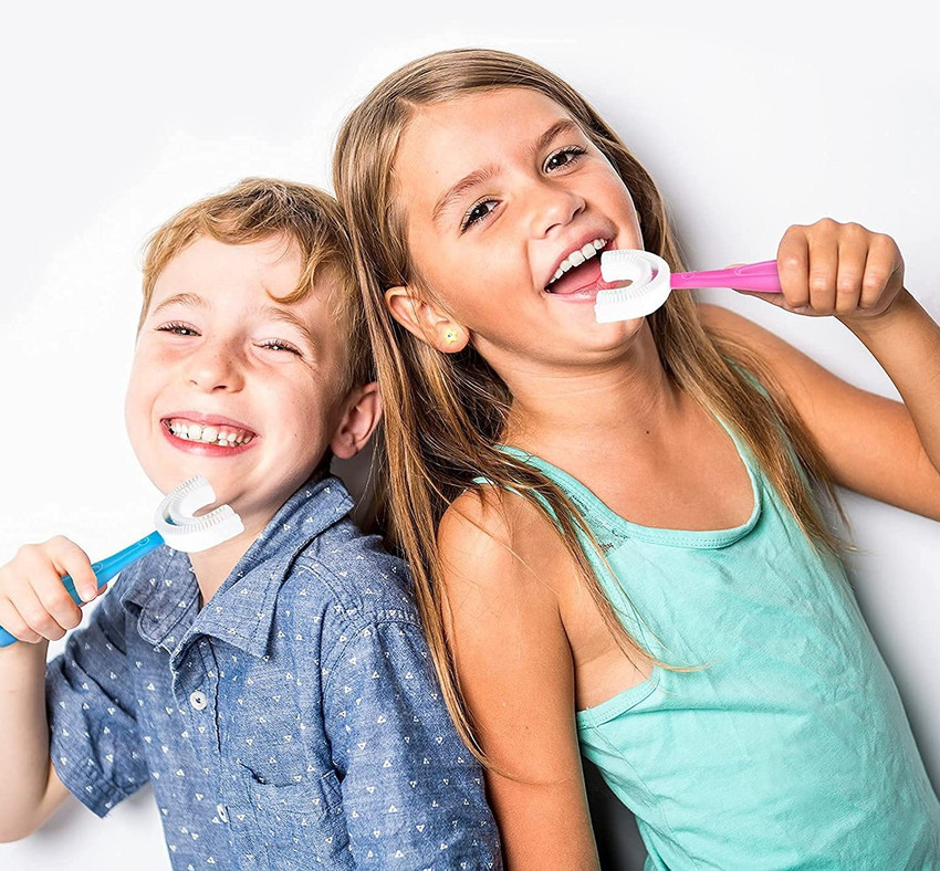 【CREATIVE U-SHAPED DESIGN】 Ergonomic U-shaped brush head, suitable for the shape and mechanics of children’s teeth structure. uniquely designed for children’s tender gums and sensitive teeth.